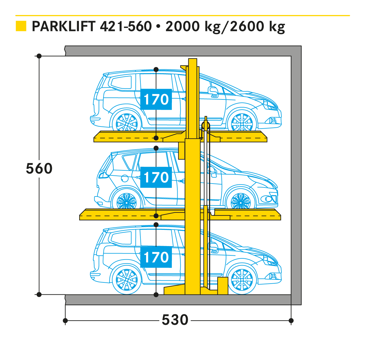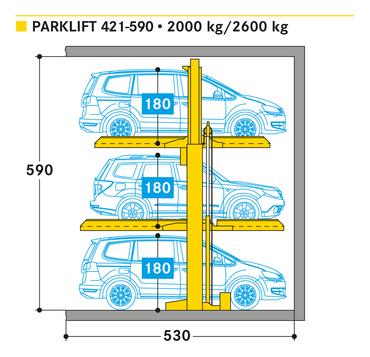 The Parklift 421 offers 3 car parking places on the surface of only 1 parking place. A compact solution where ever for retrofit additional car parking places are requried and the parked cars can be manoeuvred. For a wider range of options, the systems are suitable to be installed either side by side or in rows behind one another or even outdoors. Single unit for 3 cars above each other.