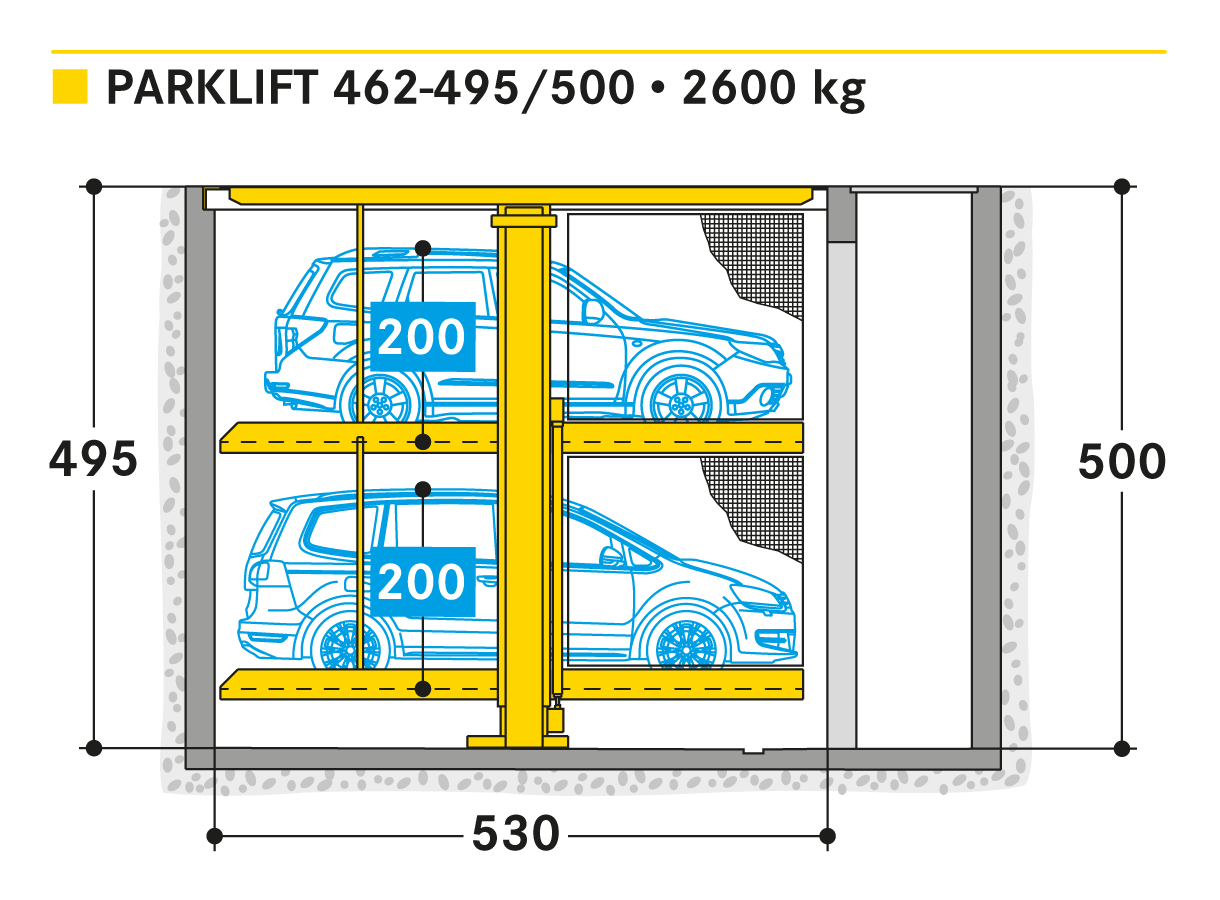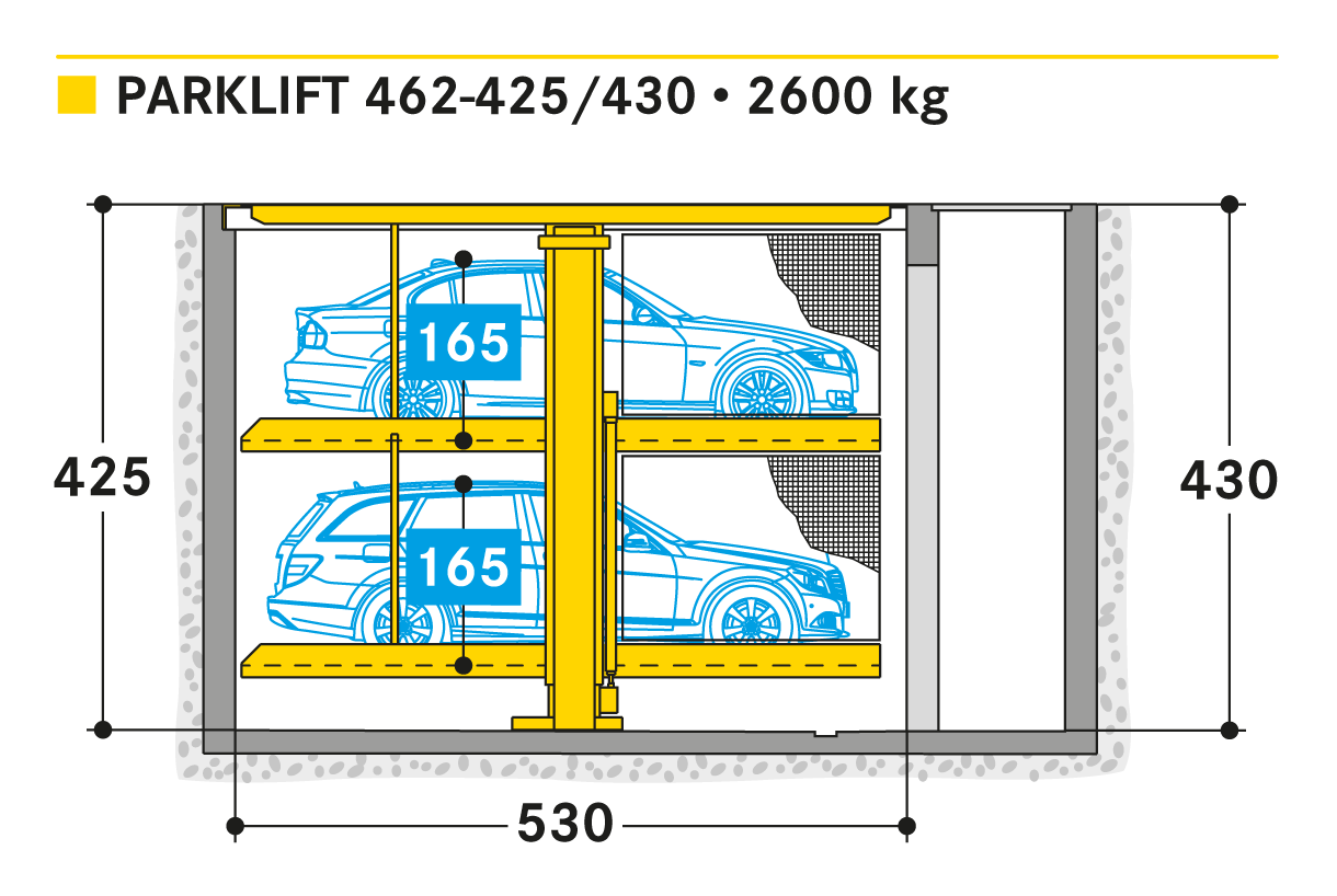 The invisible Parklift 462 will be lowered into a pit, while the horizontal platforms below ground get visible just when raised for access or exit. The upper platform can be integrated to the surrounding surface with different coverings. The Parklift 462 is suitable for courtyards, access areas or retrofit projects. Single unit for 2 cars and double unit for 4 cars.