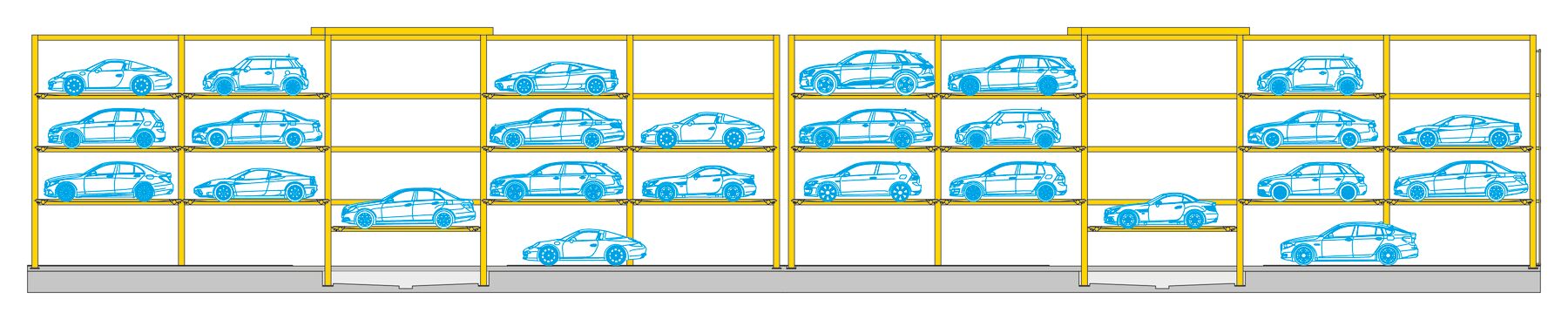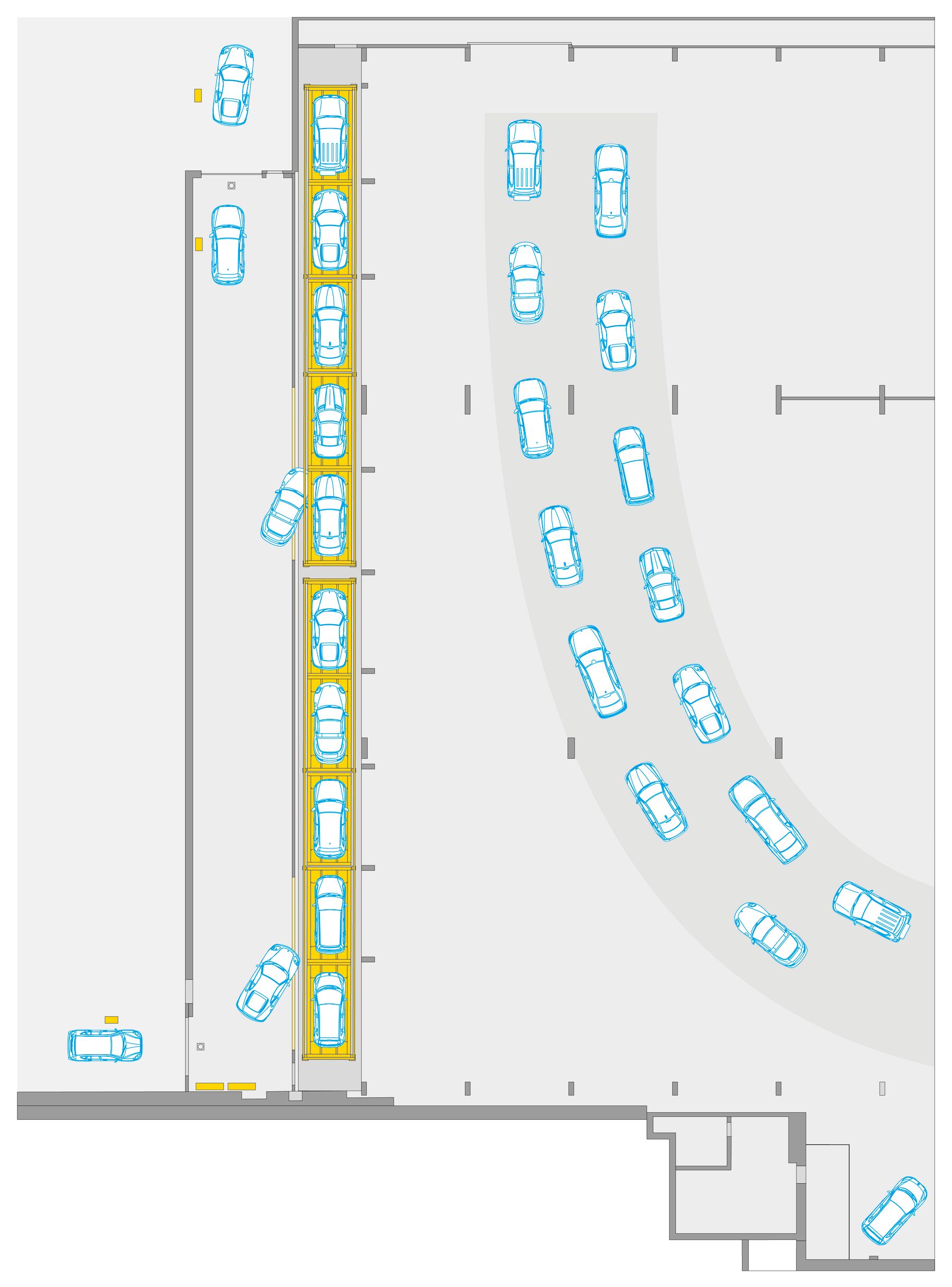 22 dream cars are housed in the two Slimparker 557s in a very special parking lot. These vehicles are stacked on three levels in the fully automated parking system on the museum façade. Thanks to the special paint finish in pure white, the system harmonizes perfectly with the museum ambience and presents the vehicles in all their glory.
