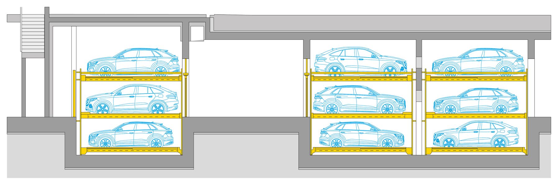 A special highlight is the spacious underground car park with 236 parking spaces, 213 of which are in WÖHR Combilifts. Divided into 21 different systems in various grid sizes, the WÖHR Combilift 543 offers enough space-saving parking spaces for all residents of the neighborhood. All parking spaces – including those with parking systems – are already equipped with e-charging stations – a clear commitment to the mobility of the future.