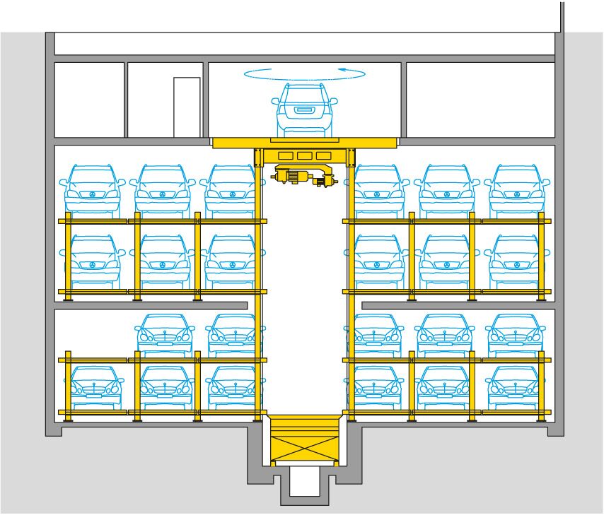 The Conseil d'Etat and Clinique St. Joseph buildings, located in the heart of Luxembourg's old town, were converted and renovated under strict adherence to architectural and historical requirements. The automatic parking system is entered at sublevel 2 via a car lift. This system features 2 rows of parking spots located behind each other on the right and left sides of the vertical conveyor, which has a long shaft to reach the top of the facility. A shuttle rests on the conveyor and moves the cars to both bays. To maximize the restricted space available, 3 parking places are arranged next to each other per bay and level. The conveyor system and software park the cars safely and reliably.
