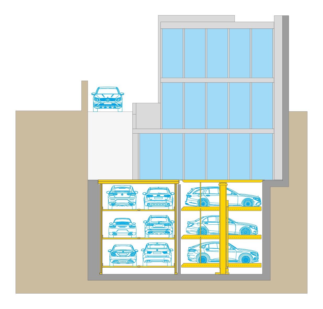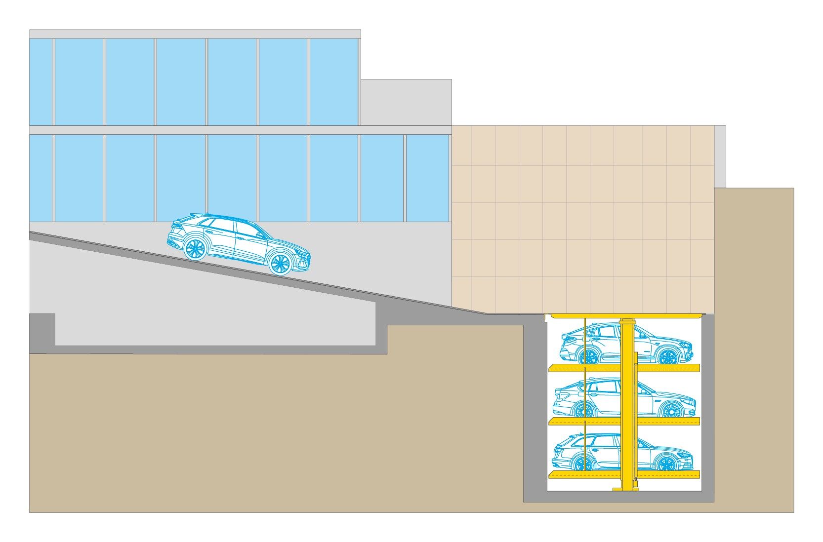 The building is indeed a prime example of energy-efficient, environmentally-friendly construction. Room ventilation and air conditioning, for instance, are run on geothermal energy (geothermal heat) and solar thermal energy (solar power). A new space and energy saving parking space solution is also part of the renewal concept. Due to the climate conditions in Madrid, a solution was required, which functions underground and is integrated into the air conditioning cycle of the building. It was decided to use WÖHR as an innovative partner for this challenging task. Two retractable mechanical double parking lifts of the model range 463-2,0 D with twelve parking spaces on three levels and one individual parking lift 462-2,3 E with two parking spaces on two levels were chosen. You can drive to the parking levels horizontally.